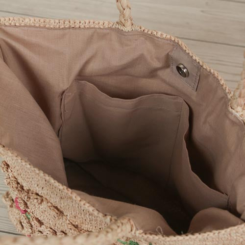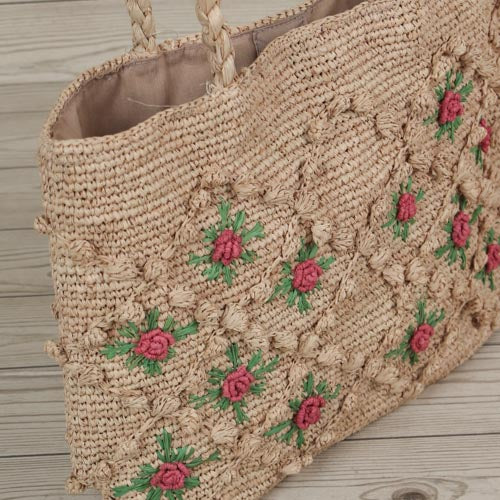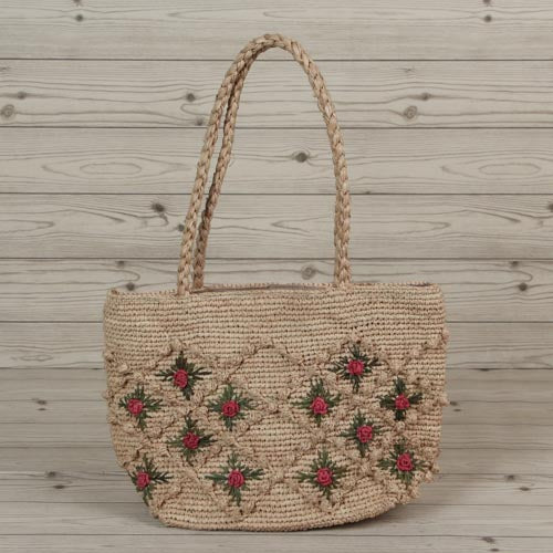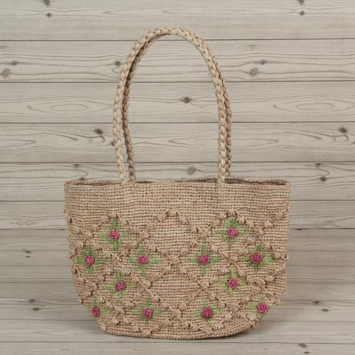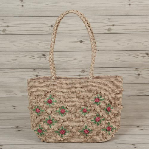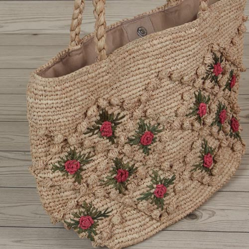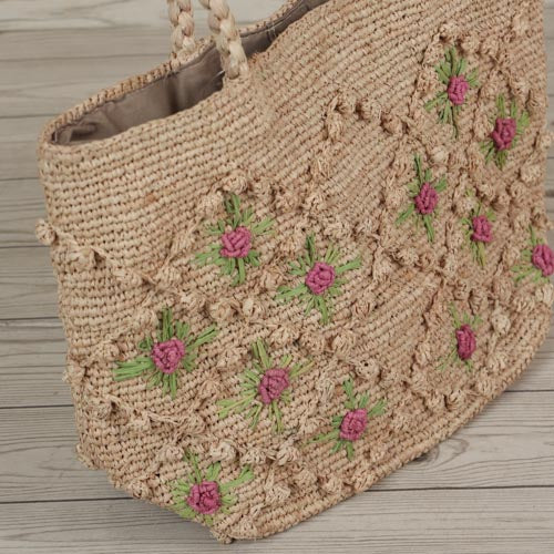 Our versatile bag is the perfect companion. Handwoven from natural seagrass fibers, it features a modern knitted pattern and is complemented by a beautiful rose motif that adds a pop of color to our bag. You can take it anywhere and it's the perfect gift for any occasion, adding a touch of elegance and style to any outfit.