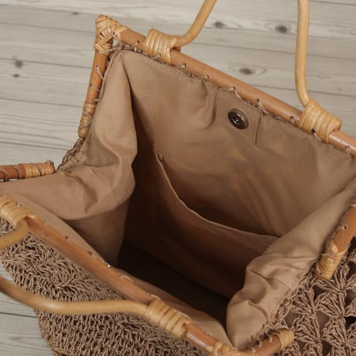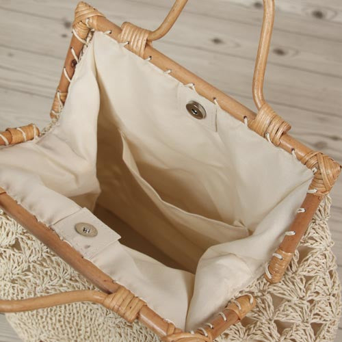 This bag is absolutely stunning, featuring meticulously crafted rattan handles that add an extra touch of luxury. The exquisite craftsmanship has made this piece so well-made that you're sure to be impressed. It's not only a work of art, but also very practical, with its lightweight construction and comfortable wooden handles that make it a pleasure to carry around.กระเป๋าใบนี้ดูน่าทึ่งอย่างยิ่ง มาพร้อมหูไม้หวายคัดสรรอย่างประณีตซึ่งเพิ่มความหรูหราเป็นพิเศษ งานฝีมือชั้นยอด ทำให้งานนี้ออกมาดีจนคุณจะต้องประทับ